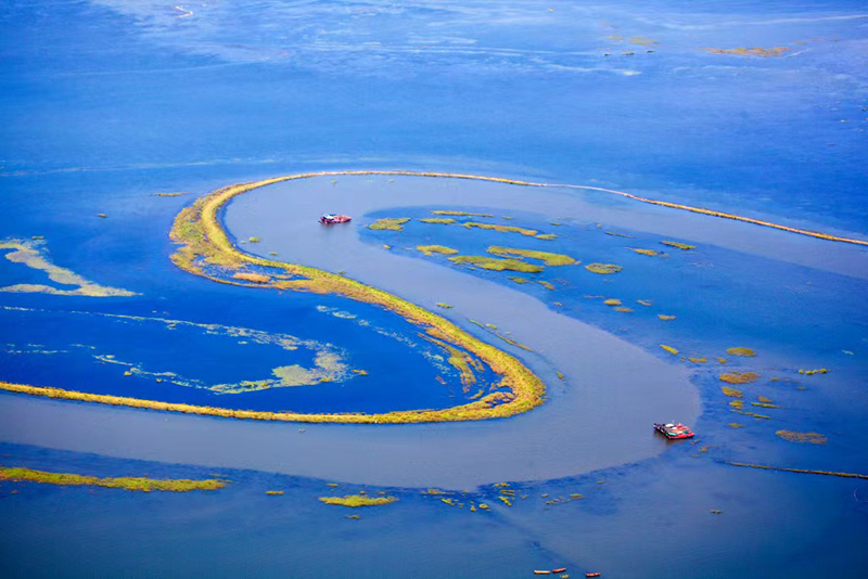 航拍鄱陽湖,小船駛過湖面。傅建斌攝