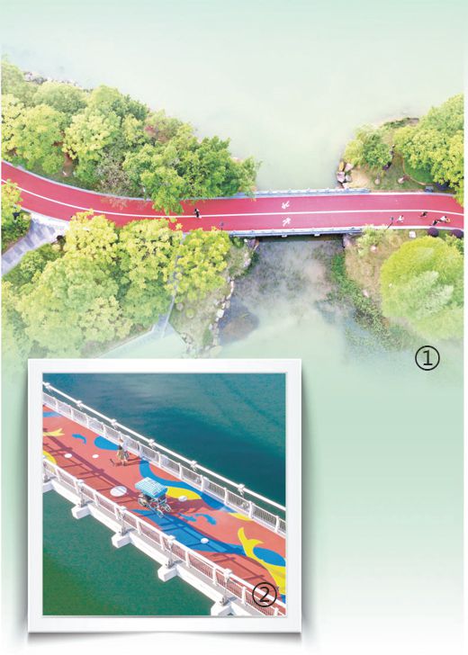 圖①:江西省贛州市章貢區一處濕地公園內的健身步道。