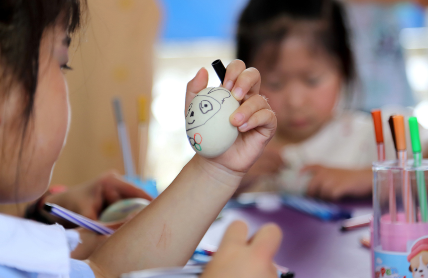 宜豐縣新昌鎮城南社區孩子們繪彩蛋。賴建定攝