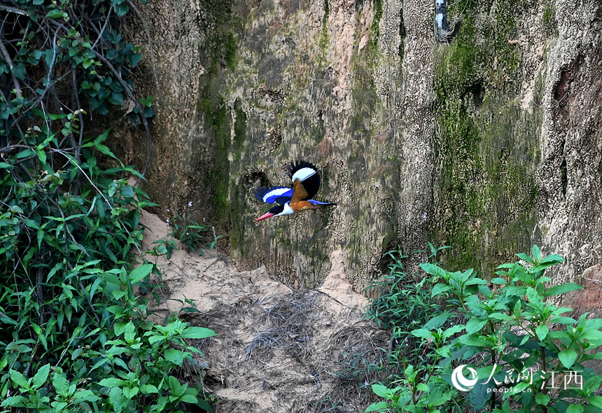 一只白胸翡翠從巢穴中飛出。 人民網 時雨攝