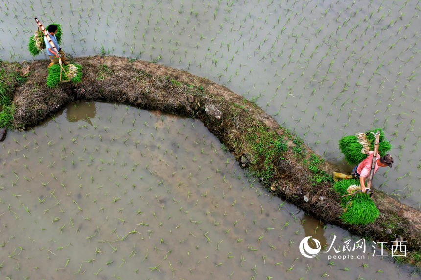 村民們將起獲的秧苗運往整理好的田塊準備插秧。 人民網 時雨攝