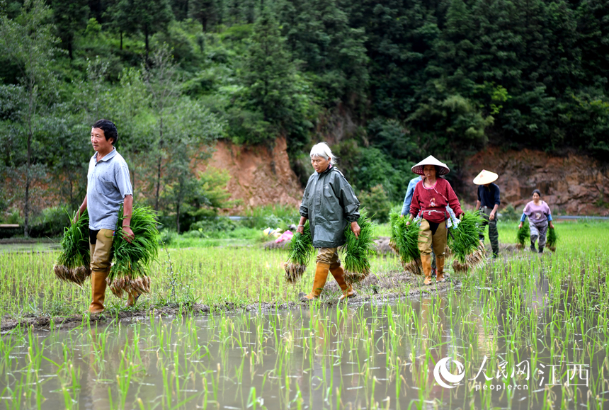 村民們將起獲的秧苗運往整理好的田塊準備插秧。 人民網 時雨攝
