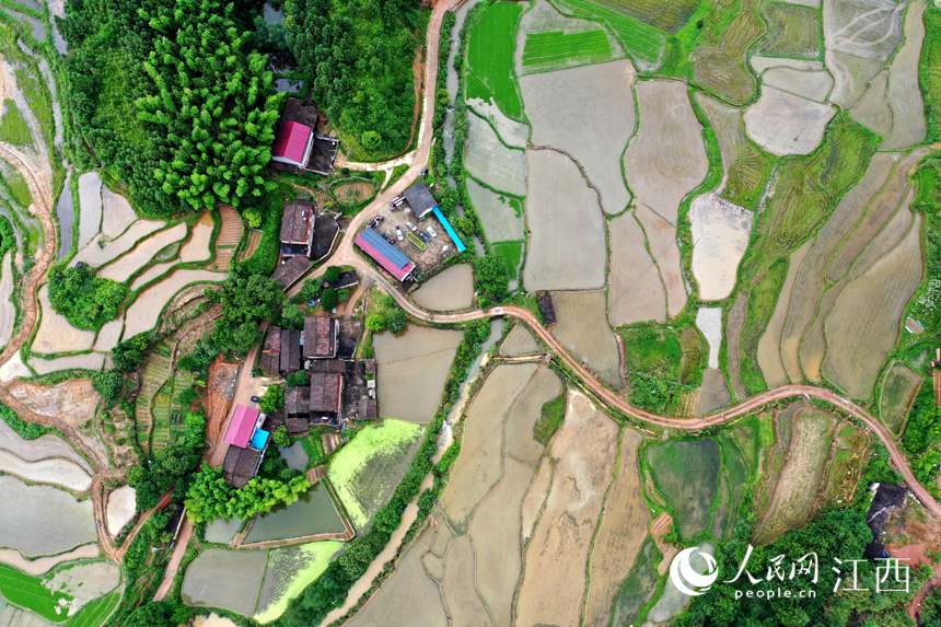 航拍鏡頭下,山間已經整理好的水田波光粼粼。 人民網 時雨攝