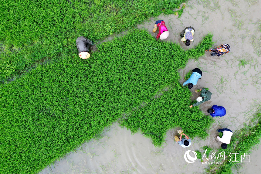 人民網資溪6月11日電(時雨)10日,在江西省撫州市資溪縣鶴城鎮泉坑村“紫姑農業”基地里,當地的村民正在山間的梯田里忙著起獲秧苗,運往已經整理好的水田里插秧。