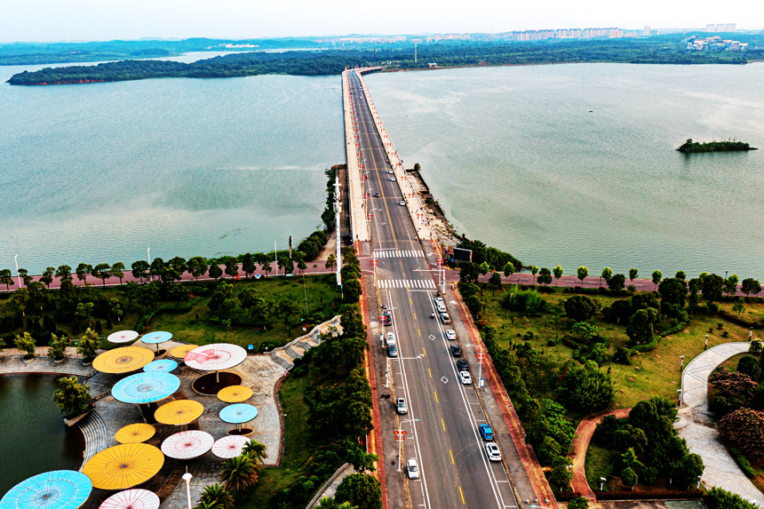 航拍下的江西省共青城市南湖大橋橫穿湖面。況建攝
