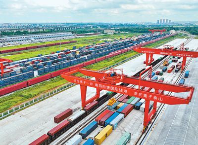 近日,隨著江西南昌國際陸港二期海關監管場所開通,南昌國際陸港全面建成運行。圖為7月7日,在南昌國際陸港,龍門吊正在進行集裝箱裝卸作業。