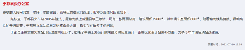 收到網友留言后,于都縣委辦公室積極回應, 經核查,于都縣火車站2005年建成,屬贛龍線上普通縣級三等站,現有一棟兩層站房,建筑面積1900㎡,其中候車室面積600㎡。隨著贛龍鐵路復線、昌贛高鐵的開通運營,于都縣火車站單日發送旅客量大增,確實存在諸多不便問題。