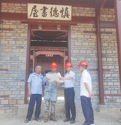 謝才壽(右二)與設計施工技術人員在慎德書屋制訂維修計劃。井岡山革命博物館供圖