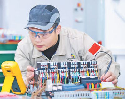 一身工服,再配以防護眼鏡,江西省電子信息技師學院高級技師、第四十五屆世界技能大賽電氣裝置項目冠軍肖星星(見圖,本報記者王 丹攝)俯身于操作面板前:只見自動剝線鉗上下翻飛,螺絲刀旋轉固定,一根根線纜依序排列整齊;接通電路,裝置順暢運轉……