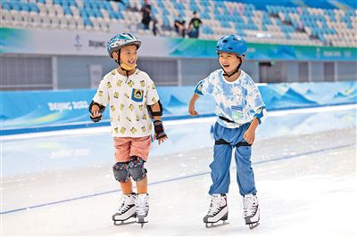 國家速滑館“冰絲帶”7月9日對外開放,圖為兩名小朋友在體驗“最快的冰”。本報記者 張武軍攝