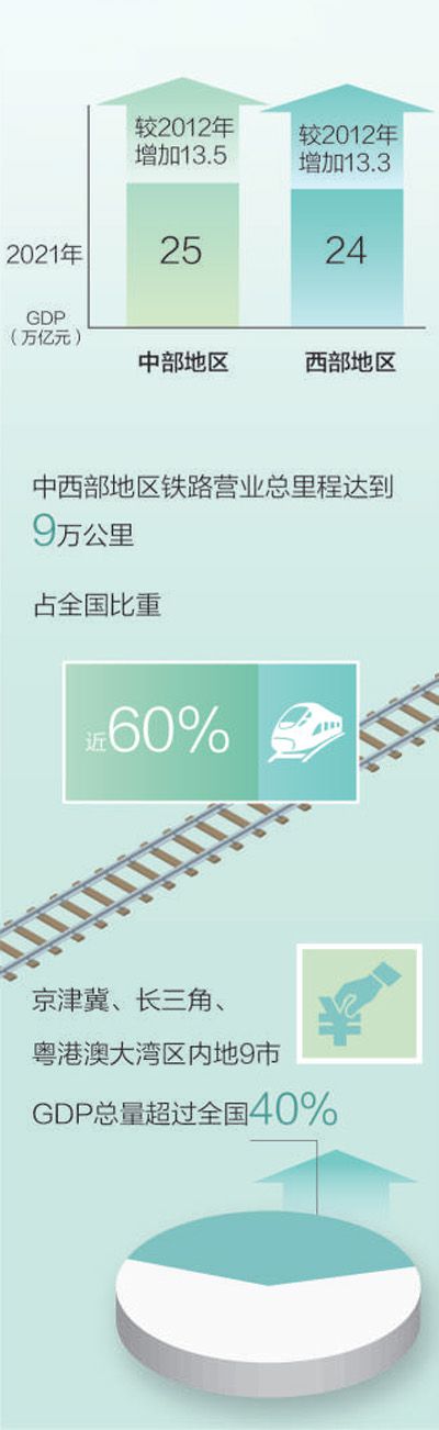 動力源地區引擎作用不斷增強。2021年,京津冀、長三角、粵港澳大灣區內地9市地區生產總值分別達9.6萬億元、27.6萬億元、10.1萬億元,總量超過了全國的40%,發揮了全國經濟壓艙石、高質量發展動力源、改革試驗田的重要作用。