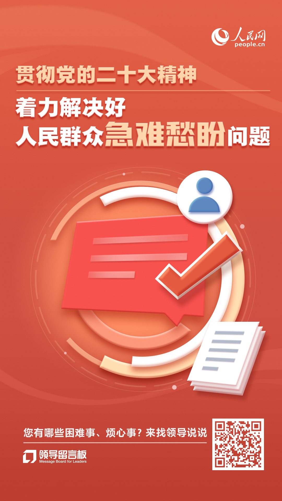 為貫徹黨的二十大精神,更好推動各地區各部門著力解決好人民群眾急難愁盼問題,更加暢通和規范群眾訴求表達、利益協調、權益保障通道,人民網“領導留言板”持續推出群眾急難愁盼問題征集。日常生活工作中,您有哪些困難事、煩心事?關于各地各行業各領域建設發展,您有哪些意見建議?來找領導說說。