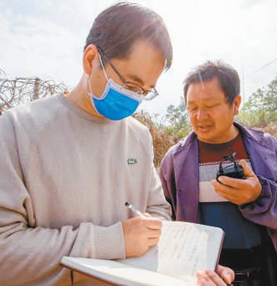 江西分社記者朱磊(前)在江西省吉安市永豐縣佐龍鄉麻田村采訪種植大戶。吳福清攝