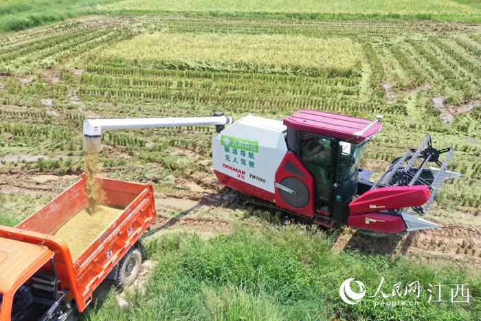南昌市南昌縣蔣巷鎮一處標準化農田里,無人收割機正在收割稻谷。人民網時雨攝