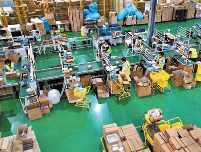 江西省龍南市保稅物流中心倉儲配貨區,工作人員在按照電商訂單進行備貨發貨。