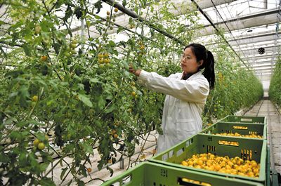 在河北省邢臺市南和區賈宋鎮現代農業示范園區,技術員武瑞娜在蔬菜種植大棚內采摘。