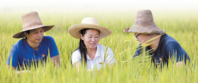 峽江縣金坪民族鄉南下村黨支部副書記石玉蓮(中)和其他村干部查看水稻生長情況。陳福平攝