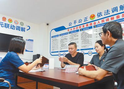 為助力打造法治化營商環境,江西省萍鄉市安源區人民法院于2022年推出“法之道”訴調對接服務站,在為企業提供法律咨詢服務的同時,引入行業調解力量,在訴前參與涉企糾紛調處。該院現已形成“法官指導+行業調解+司法確認”的商事糾紛調處模式,推動矛盾糾紛源頭治理,護航區域經濟高質量發展。圖為在萍鄉市經濟技術開發區“法之道”訴調對接服務站,法官在進行涉企糾紛調處。