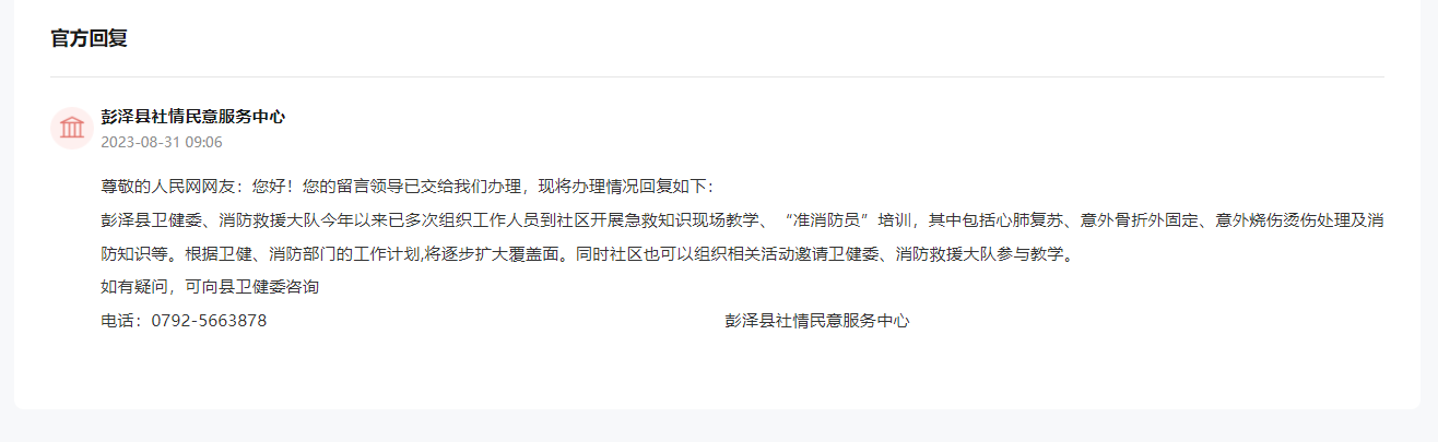 針對網友提出的建議,彭澤縣社情民意服務中心在回復中表示,彭澤縣衛健委、消防救援大隊今年以來已多次組織工作人員到社區開展急救知識現場教學、“準消防員”培訓,其中包括心肺復蘇、意外骨折外固定、意外燒傷燙傷處理及消防知識等。
