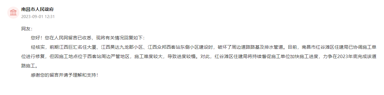 收到網友留言后,南昌市政府對有關情況進行回復。經核實,前期江西巨匯名住大廈、江西昊達九龍郡小區、江西眾邦西客站東側小區建設時,破壞了周邊道路路基及排水管道。目前,南昌市紅谷灘區住建局已協調施工單位進行修復,但因施工地點位于西客站周邊嚴管地區,施工難度較大,導致進度較慢。對此,紅谷灘區住建局將持續督促施工單位加快施工進度,力爭在2023年底完成該道路施工。