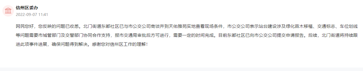 上饒市信州區委辦回復中表示,北門街道東都社區已與市公交公司商談并到天佑雅苑實地查看現場條件,市公交公司表示站臺建設涉及綠化苗木移植、交通標志、車位劃線等問題需要市城管部門及交警部門協同合作支持,報上饒市交通局審批后方可進行,需要一定的時間完成。目前東都社區已向市公交公司提交申請報告。后續,北門街道將持續跟進此項事件進展,確保問題得到解決。
