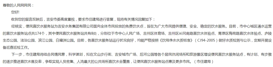 收到網友留言后,吉安市住建局就相關情況進行答復。經核實,便民直飲水服務站為吉安水務集團有限公司面向全體市民投放的免費飲水點,旨在為廣大市民提供便捷、安全、穩定的飲水服務。目前,該市中心城區通水運營的直飲水服務站點共174個,其中便民直飲水服務站共有8處,分別位于市中心人民廣場、吉州區體育場、吉州區長岡南路直飲水體驗點、青原區梅苑路直飲水體驗點、廬陵生態公園、法治公園、濱江公園、白鷺洲公園。目前,各直飲水服務站運行狀況良好,均能嚴格按照《飲用凈水水質標準》(CJ94-2005)做好水質檢測與公示,定期開展設備巡查巡檢工作。