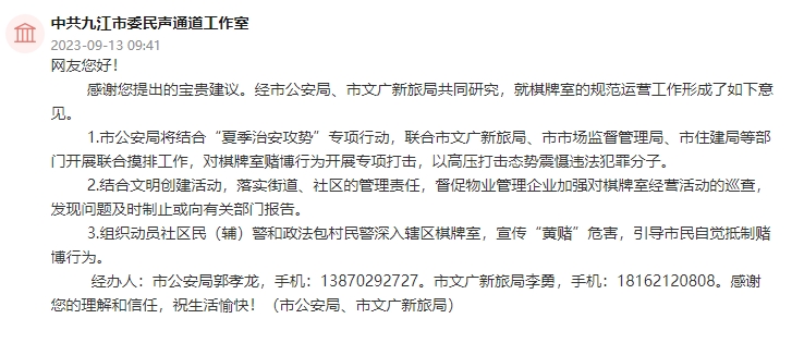 收到網友建議后,九江市公安局、市文廣新旅局共同研究,就棋牌室的規范運營工作形成了如下意見。
