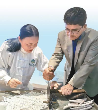 10月26日,2023“一帶一路”媒體合作論壇聯合采訪團走進江西省樟樹市樟幫中醫藥一條街非遺館。圖為采訪團成員正在體驗中藥炮制技藝。