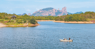 江西省上饒市弋陽縣飲用水源水庫,工作人員乘船開展水生態監測。今年以來,弋陽縣積極踐行“綠水青山就是金山銀山”理念,組建專門隊伍開展水資源生態環境保護,守護水常清、岸常綠的水源環境。