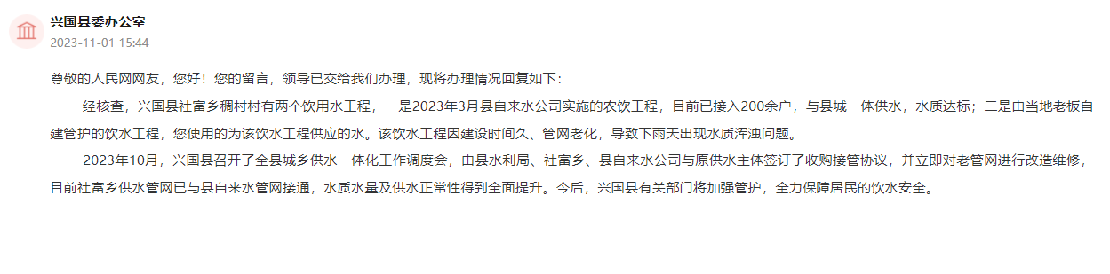 經核查,興國縣社富鄉稠村村有兩個飲用水工程。一是2023年3月縣自來水公司實施的農飲工程,目前已接入200余戶,與縣城一體供水,水質達標;二是由當地老板自建管護的飲水工程,網友所反映使用的為該飲水工程供應的水。該飲水工程因建設時間久、管網老化,導致下雨天出現水質渾濁問題。