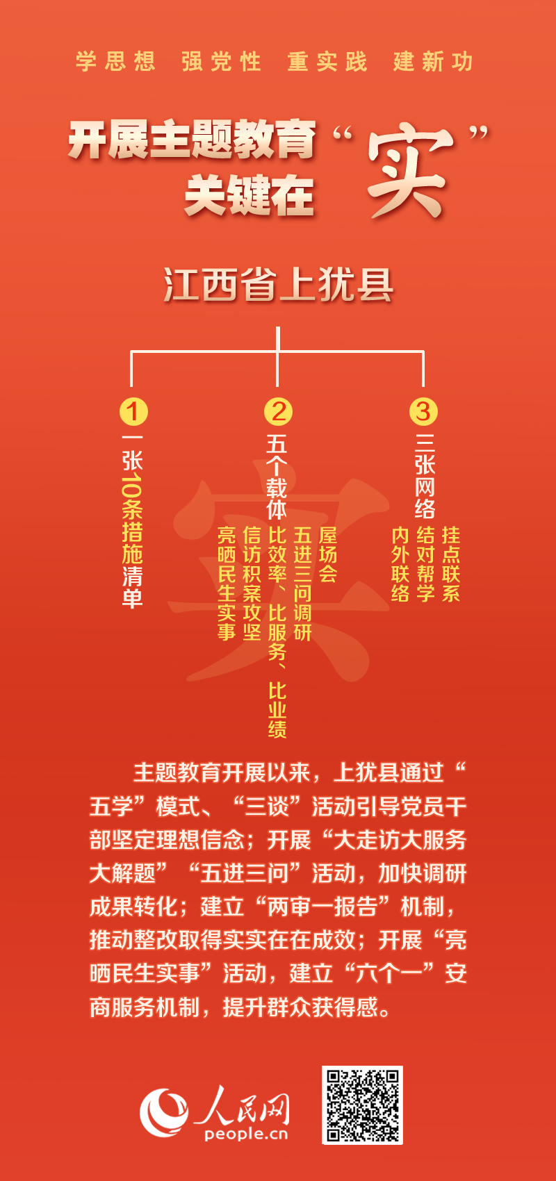 主題教育中,上猶縣廣泛開展進機關、進村組、進社區、進企業、進項目一線,問政于民、問需于民、問計于民的“五進三問”活動。全縣各級領導干部通過“接訪下訪”“敲門問政”等形式,下沉社區、走進村組掌握社情民意。鄉鎮和縣直部門(單位)廣泛開展“換位大體驗”“亮曬民生實事”等活動,主動發現、整改群眾辦事過程中存在的“業務不精”“流程不優”等服務不通暢環節,著力解決群眾急難愁盼問題。