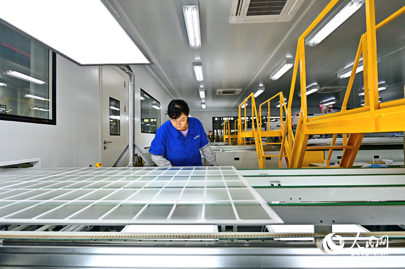 江西省贛州市定南縣的一家專精特新企業智能車間,工人在自動化生產線上加工光伏玻璃。人民網 朱海鵬攝