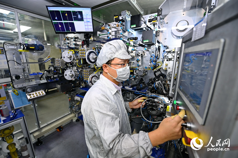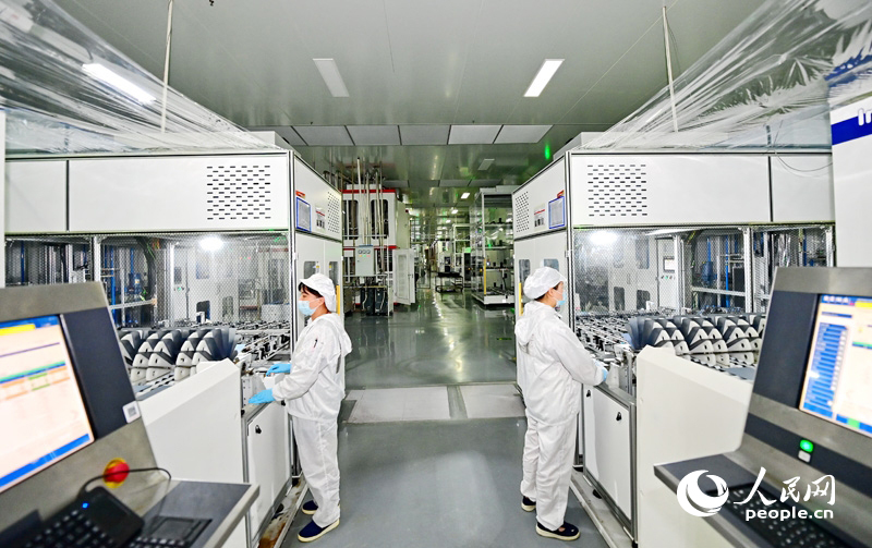 江西省贛州市安遠縣產城新區的一家鋰電新能源電池企業生產車間內,工人在加工出口的鋰離子微型電池產品。人民網 朱海鵬攝