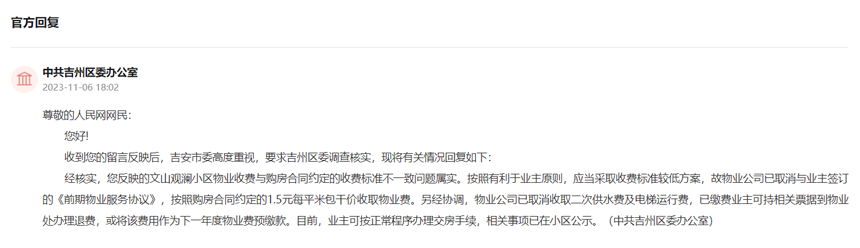 收到網友留言后,吉安市委民聲通道工作室回復稱,經核實,網友反映的文山觀瀾小區物業收費與購房合同約定的收費標準不一致問題屬實。按照有利于業主原則,應當采取收費標準較低方案,故物業公司已取消與業主簽訂的《前期物業服務協議》,按照購房合同約定的1.5元每平方米包干價收取物業費。
