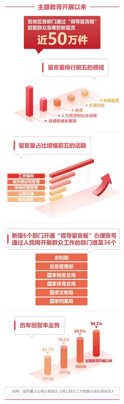 黨的十八大以來,來自廣大群眾和經營主體的420萬件留言通過該平臺得到各地區各部門回復辦理,一批建設性意見得到采納。主題教育開展以來,各地區各部門通過“領導留言板”群眾急難愁盼問題征集活動,已回應和解決近50萬件群眾訴求。