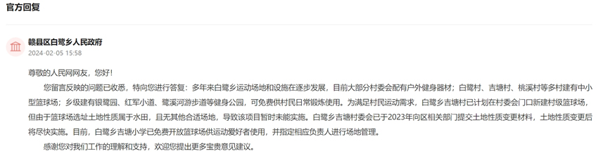 收到網友留言后,贛縣區白鷺鄉人民政府進行了答復。稱多年來白鷺鄉運動場地和設施在逐步發展,目前大部分村委會配有戶外健身器材;白鷺村、吉塘村、桃溪村等多村建有中小型籃球場;鄉級建有銀鷺園、紅軍小道、鷺溪河游步道等健身公園,可免費供村民日常鍛煉使用。