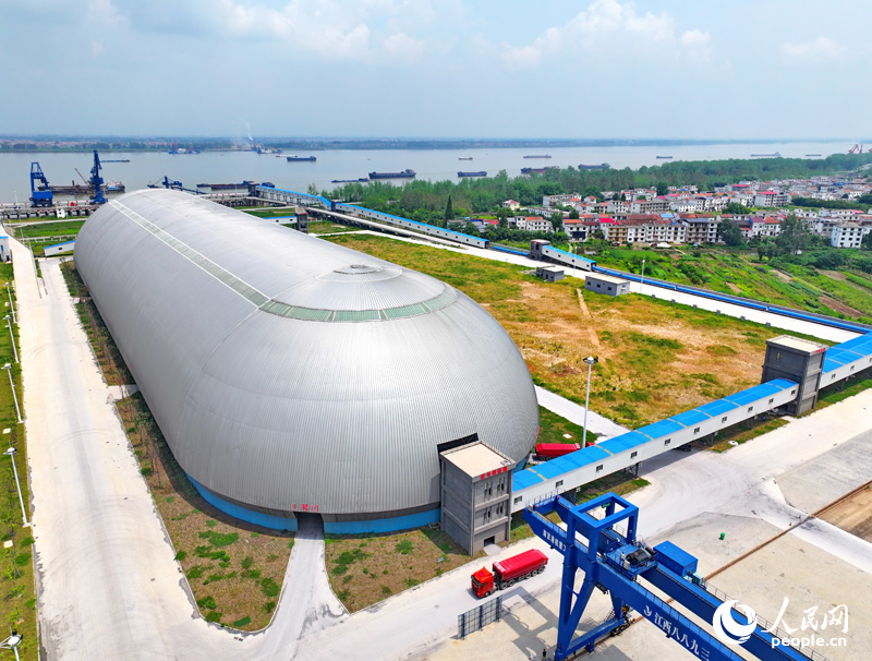 位于九江柴桑區的九江港赤湖作業區公用碼頭的“膠囊”倉庫,是全國第二個、江西首個新型智慧散貨碼頭。人民網 朱海鵬攝