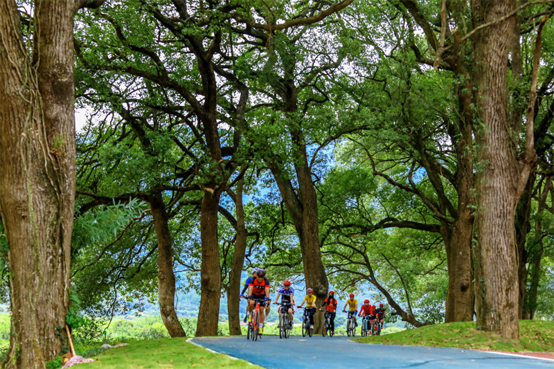 騎行愛好者在樂安古樟樹林中穿行。黃煜攝