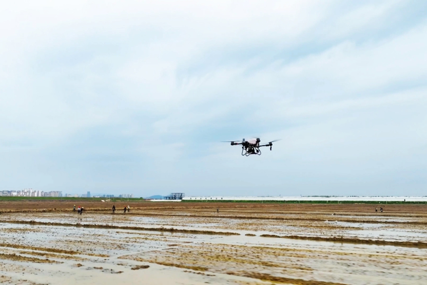 “無人機播種一天8小時,能播600畝至700畝,而純人工大概需要30個人左右才能完成?!痹诠睬喑鞘刑K家垱鄉漿潭聯圩一分場高標準農田,伴隨著旋翼的嗡鳴聲,一臺搭載著早稻種子的農用無人機飛上了天空。無人機在空中自如穿梭,將稻種準確地播撒到耕好的田塊里。