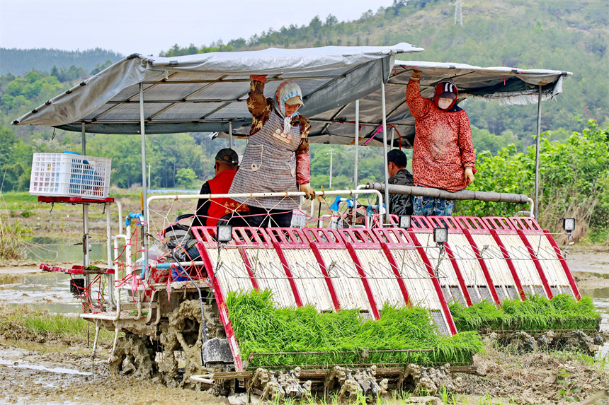 種糧戶駕駛插秧機在進行機械化插秧,田間地頭一派繁忙景象。人民網 朱海鵬攝