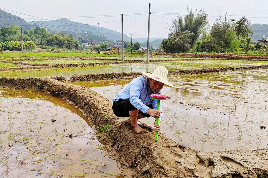 劉德文在田埂上安裝太陽能音樂播放器。詹繼成攝