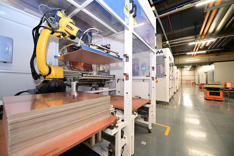 贛州市章貢區一印刷線路板企業生產車間,工業機器人、AGV運轉機器人分工協作生產出口線路板產品。人民網 朱海鵬攝