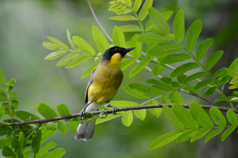 “快看,藍冠噪鹛就在那兒!”順著俞旺金所指的方向看去,兩只羽毛艷麗的鳥兒棲息枝頭,藍冠、黃喉、黑臉、褐腰,“滴鉤滴鉤”的叫聲異常清脆悅耳。