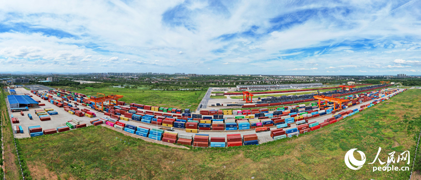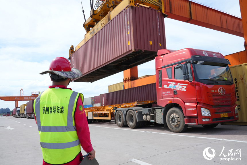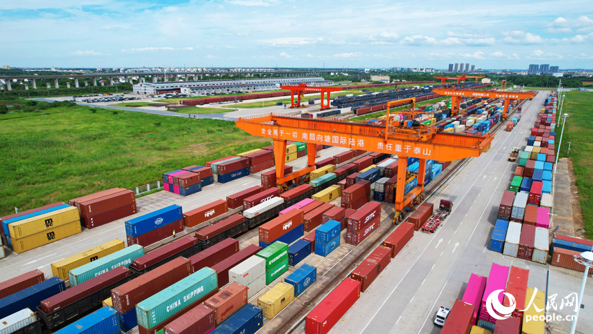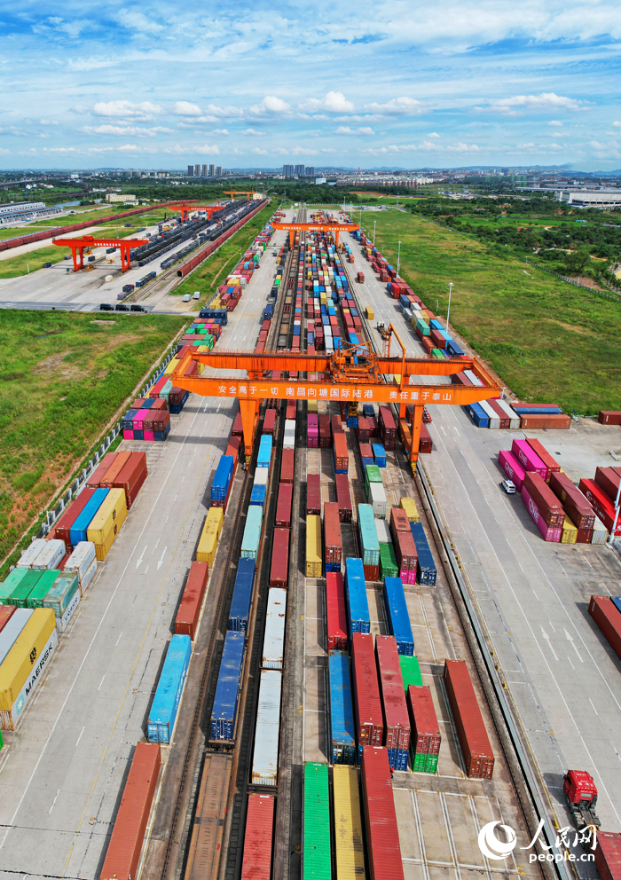 人民網南昌7月20日電 (記者毛思遠)近日,位于江西省南昌市南昌縣的南昌國際陸港貨場,貨運班列、集裝箱運輸車裝卸繁忙,準備出口汽車和各種貨柜整齊排列。