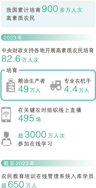 目前,我國累計培育900多萬人次高素質農民。嘗鮮新技術、涉足新業態,一批批高素質農民積極擁抱專業化、規?;?、標準化的現代經營理念,為農業農村發展保持穩中向好態勢提供了有力支撐。