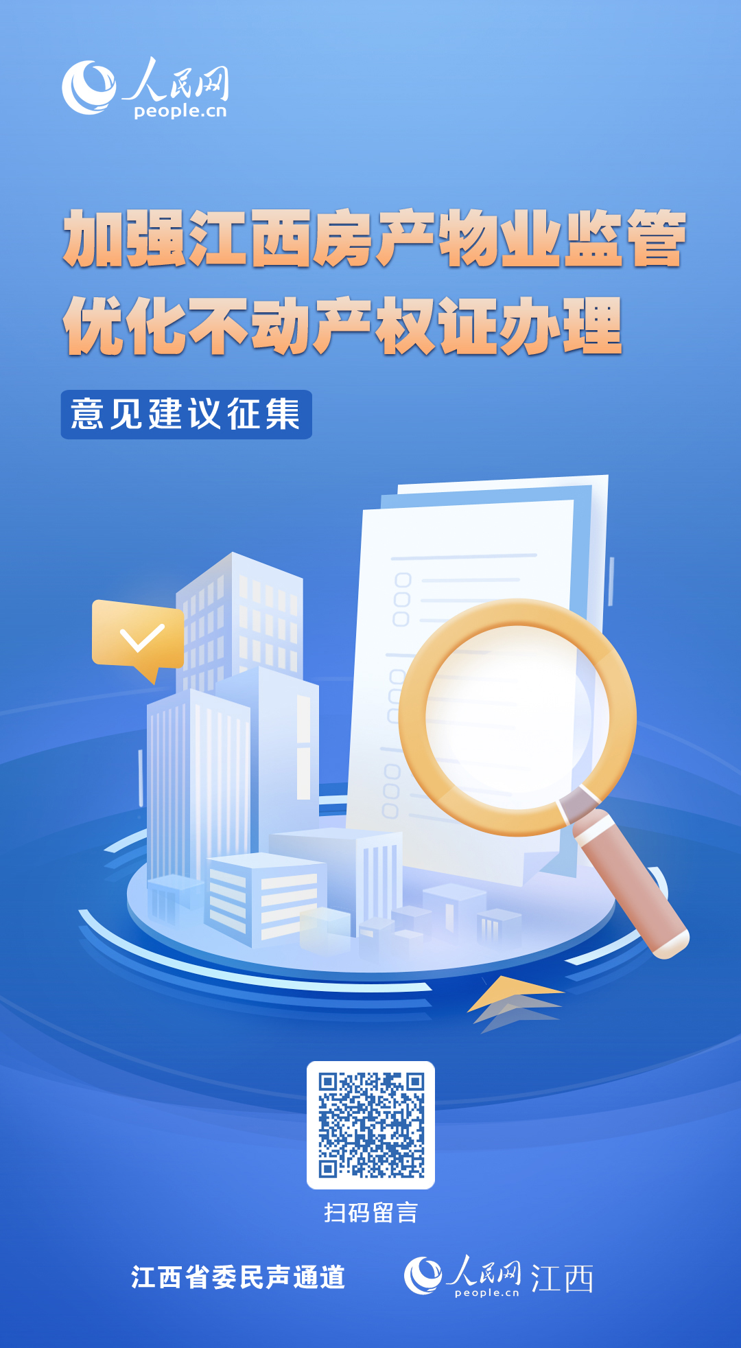 人民網南昌8月30日電(帥筠、楊伊、高麗)為推動江西省房產物業監督監管水平進一步提升,不斷提高不動產權證辦理服務工作質效,即日起,江西省委民聲通道聯合人民網江西頻道開展“加強江西房產物業監管 優化不動產權證辦理”意見建議征集,期待您的留言。