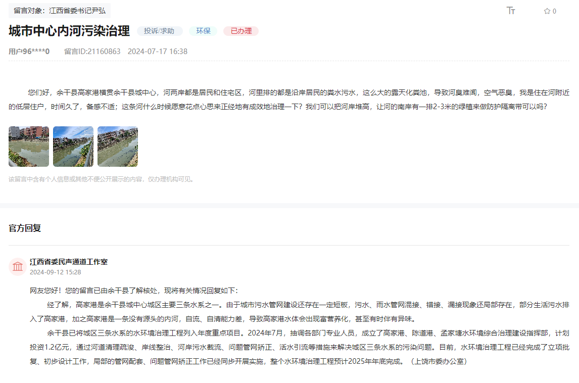 關于反映余干縣高家港水體出現富營養化,部分河段水質渾濁、散發異味的問題。經余干縣委核辦,該縣已將高家港、陳道港、孟家塘3條水系的水環境治理工程列入年度重點項目,成立綜合治理建設指揮部,計劃投資 1.2億元。目前,已完成立項批復、初步設計工作,正在同步開展問題管網矯正等工作,整個工程預計2025年年底完成。