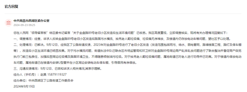 收到網友留言后,中共南昌市西湖區委辦公室立即調查核實,并將有關辦理情況進行回復。