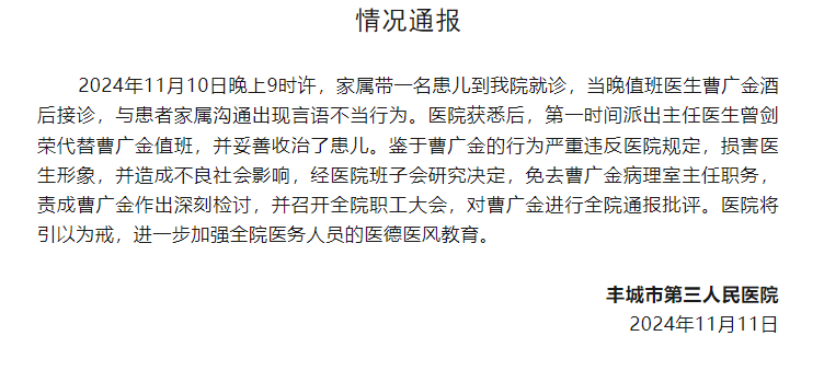 人民網南昌11月11日電 (記者羅娜)11日,據江西豐城市第三人民醫院消息,11月10日晚上9時許,家屬帶一名患兒到該院就診,當晚值班醫生曹廣金酒后接診,與患者家屬溝通出現言語不當行為。
