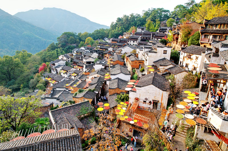時下的婺源篁嶺,徽派風格的傳統建筑間,火紅的楓葉、金黃的銀杏、橙紅的柿子,與精心布置的農作物曬秋,相映成趣,儼然一幅大自然的秋冬水彩畫。